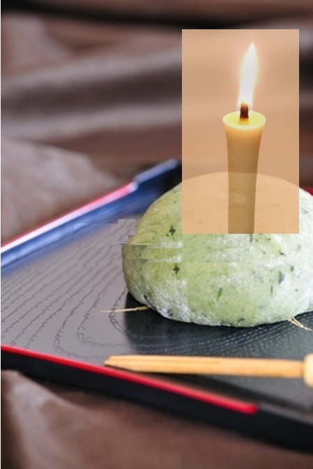 大福に仏壇用のろうそくを立てます