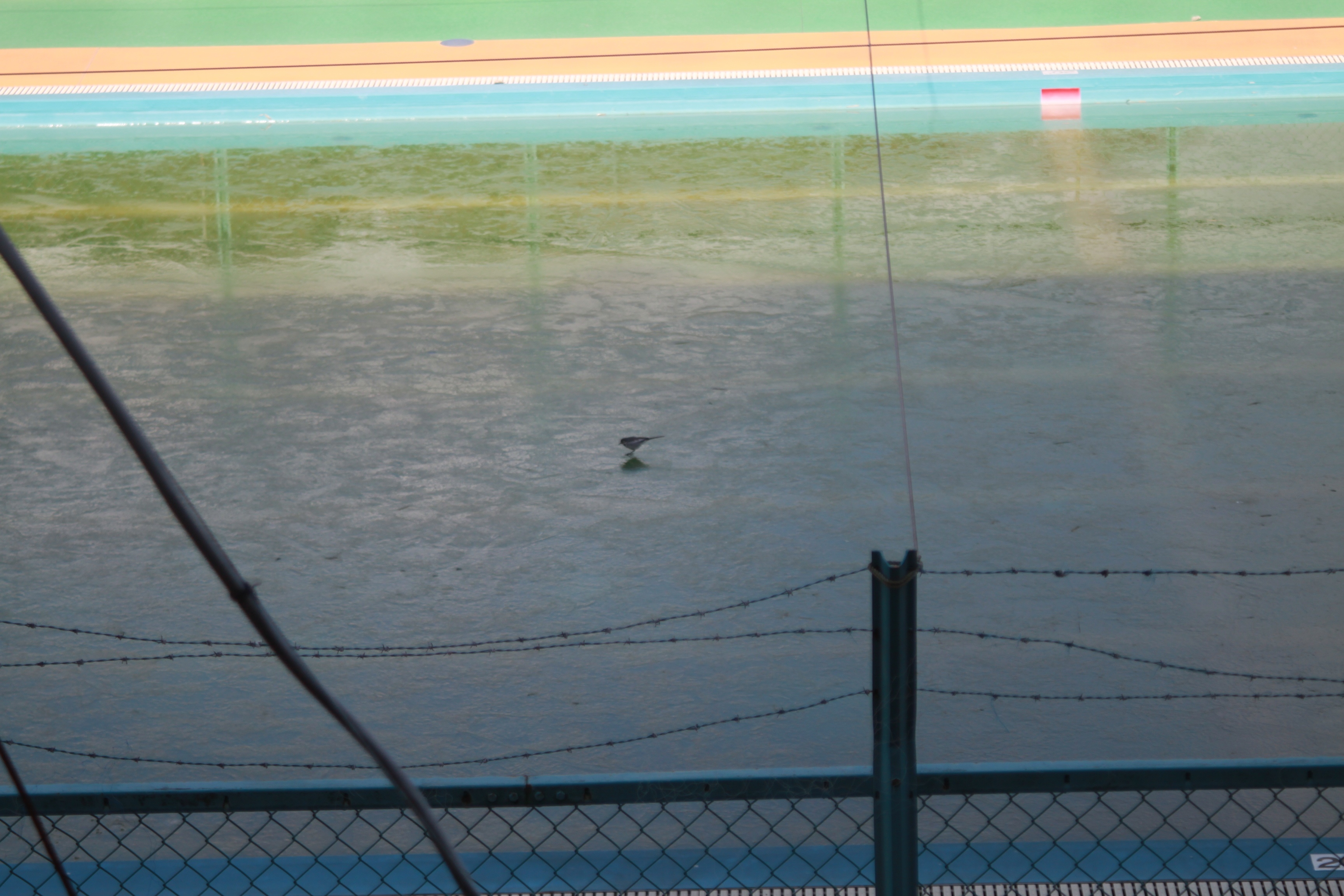 プールに氷が張って 「鳥」が水を飲むために がんばっています