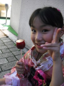 さいごに りんごあめをたべました とってもあまいです